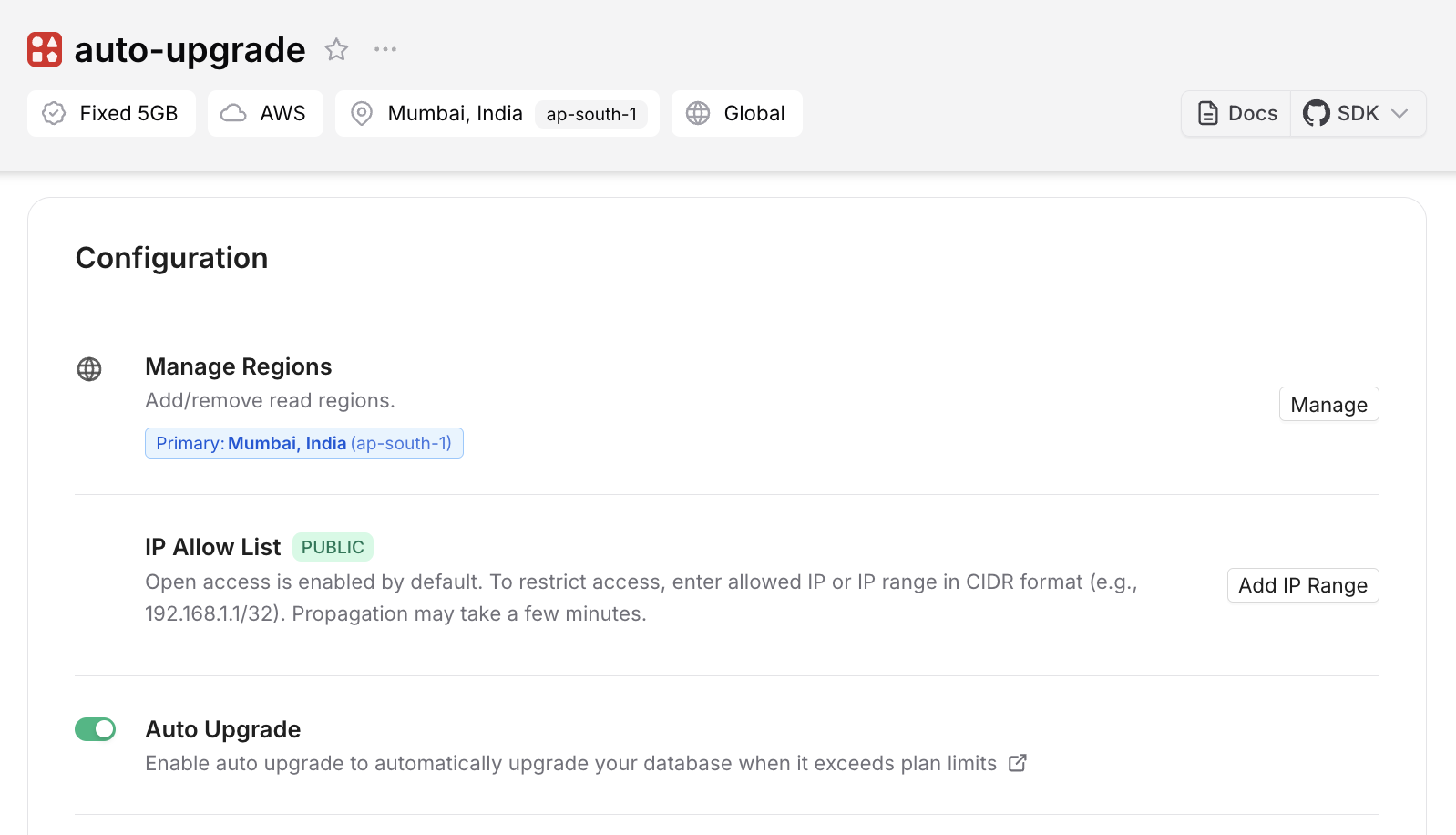 When enabled:- For bandwidth limits: Instead of throttling your traffic when you reach the bandwidth limit, your database will automatically upgrade to the next plan to accommodate the increased traffic.